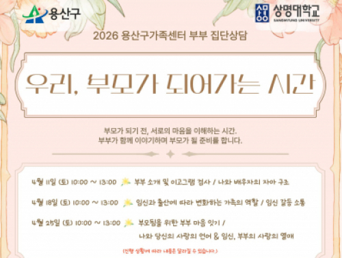 [용산구] 부부 집단상담 '우리, 부모가 되어가는 시간' 행사일시 | 2026-04-11 10:00 ~ 2026-04-25 13:00