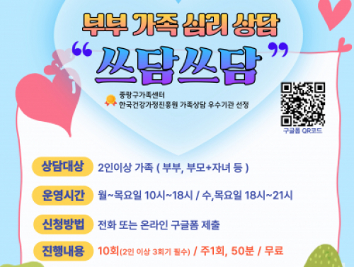 [중랑구] 2026 부부가족심리상담"쓰담쓰담" 상담 신청 접수중 행사일시 | 2026-03-19 15:48 ~ 2026-11-01 23:00