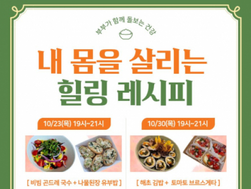 [서초구]내 몸을 살리는 힐링 레시피!(50~60대 대상 저속노화 요리 체험) 행사일시 | 2025-10-23 19:00 ~ 2025-10-30 21:00