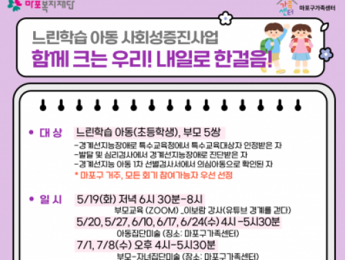 [마포구] 느린학습아동 사회성증진사업 행사일시 | 2026-05-19 18:30 ~ 2026-07-08 17:30