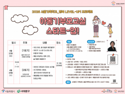 [동대문구] 아동기부모교실 신청접수중! 행사일시 | 2026-04-14 10:30 ~ 2026-04-28 12:30
