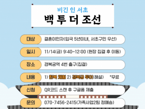 [서초구] 한복입고 경복궁 투어가자! <백 투 더 조선> 참여자 모집 행사일시 | 2025-11-14 09:40 ~ 12:00