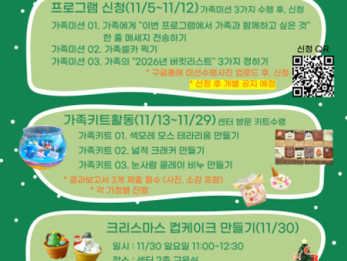 접수기간 | 2025-11-04 00:00 ~ 2025-11-12 00:00취약위기가족(한부모가정, 기초생활수급 및 차상위 가정, 온가족보듬사업 이용경험자, 다자녀가정 우선 모집)