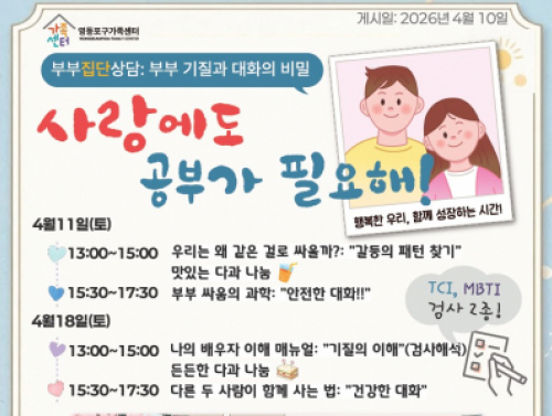 [영등포구] [부부 집단 상담] 사랑에도 공부가 필요해! 부부 기질과 대화의 비밀 행사일시 | 2026-04-11 13:00 ~ 2026-04-18 18:00