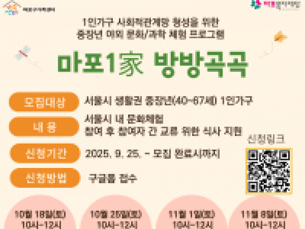 ‘마포1家 방방곡곡’(하반기) 참여자 모집 2025-09-25 18:13 | e-book (자치구센터) | 138 ‘마포1家 방방곡곡’(하반기) 참여자 모집 중장년(40~67세)의 사회적 관계망 형성을 위한 마포1家_방방곡곡이 진행됩니다. 서울의 이곳저곳을 구경하며 힐링하시고 싶었던 분들의 많은 관심과 참여 부탁드립니다. 1.대상: 서울시 생활권 중장년(40~67세) 1인가구 15명 *가산점: 마포구생활권, 모든 회기 참여가능할 시