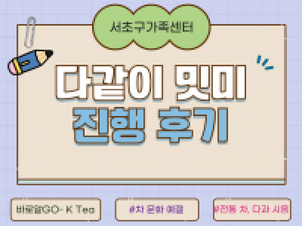 [서초구가족센터]9월 다같이 '밋미' 진행후기~ 2025-09-24 18:47 | e-book (자치구센터) | 138 9월 다같이 '밋미' 진행후기~ 결혼이민자 및 다문화가족을 모여서 다문화가정초기정착을 도와주는생활교육과 문화체험 프로그램을 진행하였습니다~ 1.한국 전통 다과 및 차 문화예절 배우기 2.한국 전통 다과 및 차 시음 ★ '다같이 밋미' 참여하신 모든 분들께 감사드립니다~ 다음 회기(11/18)에 찾아뵙겠습니다!