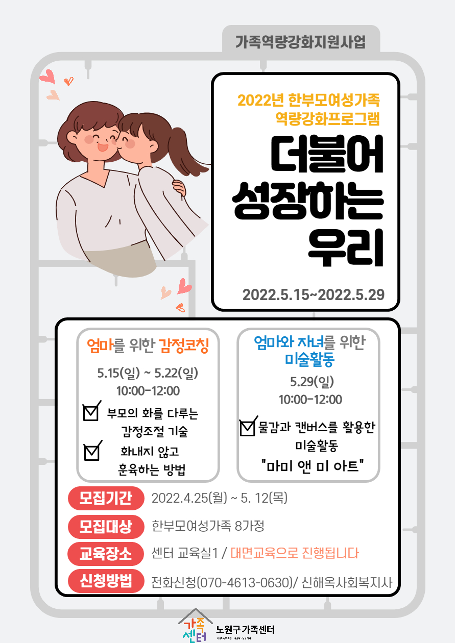 - 내용 : 1~2회기 - 모 대상 감정코칭/ 3회기 - 모, 자녀대상 미술활동