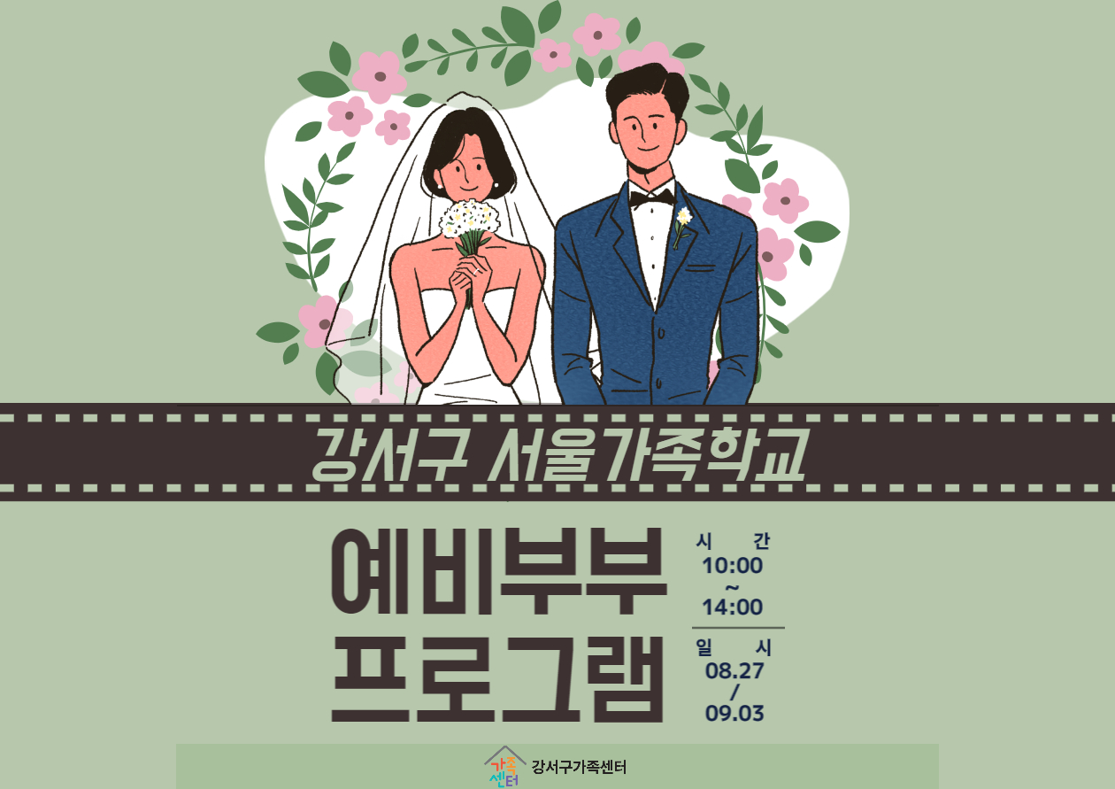 결혼을 준비하는 예비부부는 하루에도 몇 번씩 설렘과 불안 사이를 오고 가지요. 강서구 [예비부부교실]에 참여해 보세요. 건강하고 행복한 결혼생활을 위해 서로의 차이를 발견하고, 효과적으로 의사소통하는 방법을 배울 수 있습니다. 사랑과 결혼의 의미를 다시 한번 짚어보고, 결혼 생활을 요모조모 함께 설계하다 보면 불안은 사라지고, 기대는 더욱 커질 겁니다.