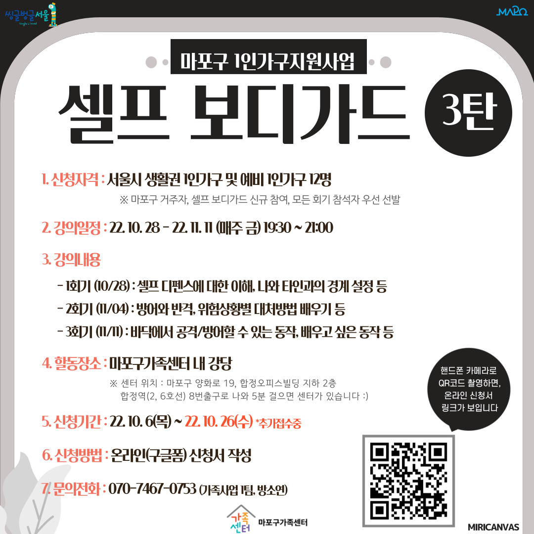 참고로, 마포구 거주자, 셀프 보디가드 신규 참여자, 3회 모두 참석가능한 자 우선 선발된다는 점 기억해주세요!!