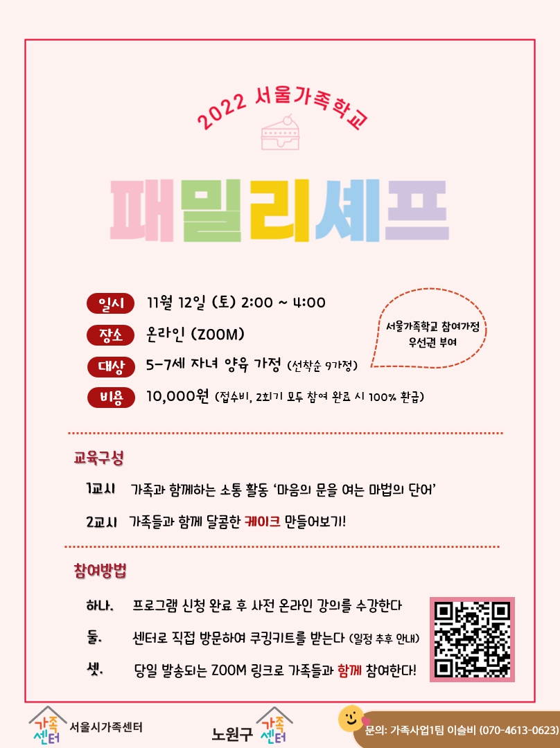 맞벌이에, 집안일에 바빠 정작 아이들과 온 가족이 함께하는 온전한 시간은 늘 뒷전이었나요? 함께 시간을 보내고 추억을 만들고 싶어도 무엇을 하면 좋을지 잘 모르시겠다면, 서울가족학교의 [패밀리셰프]를 신청해 보세요. 엄마도 아빠도 아이도 동등하게 요리에 참여하며 특별한 시간을 보낼 수 있습니다.