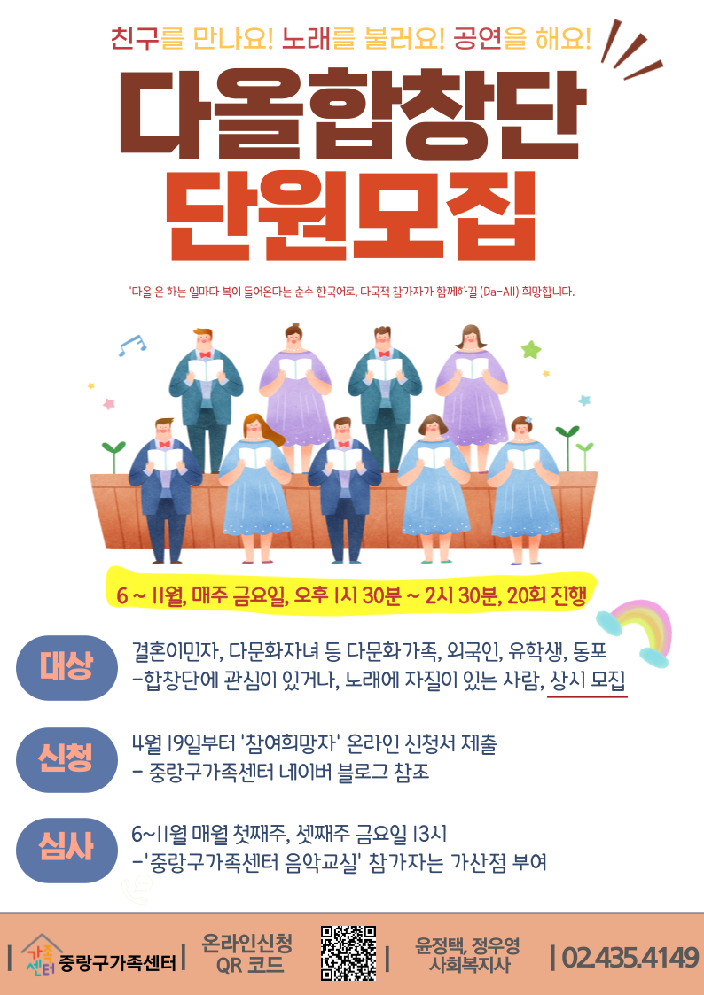 ※ '중랑구 가족센터 음악교실' 참가자에게는 가산점을 부여하오니 음악교실에도 많은 관심 부탁드립니다!