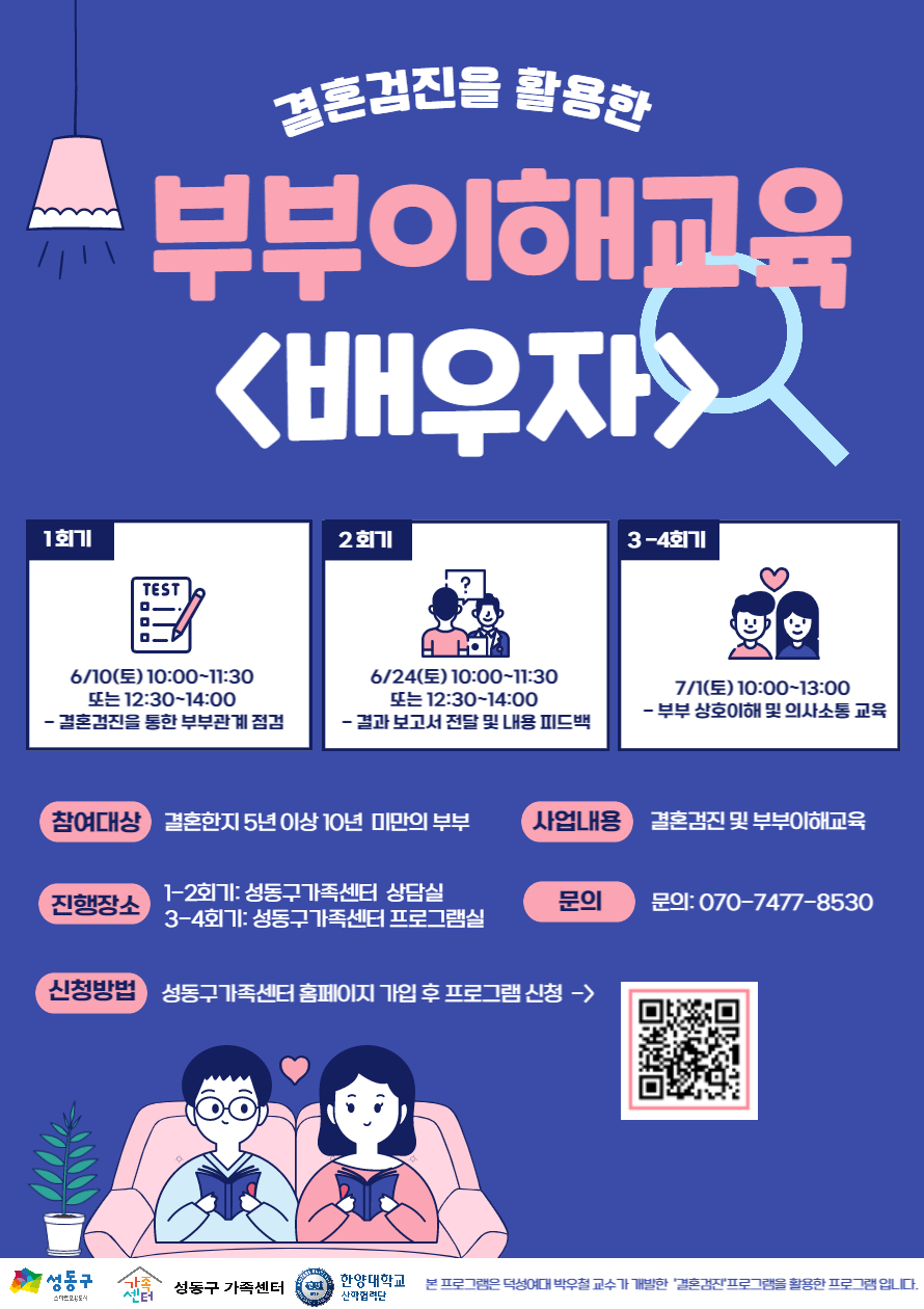 성동구가족센터에서는 다양한 검사로 부부관계를 점검할 수 있는 결혼검진을 활용한 부부이해교육을 실시합니다. 매년 받는 건강검진처럼 부부관계도 검진받아 건강한 부부관계를 유지하세요! 서로를 이해하며 건강한 의사소통 방법을 배우고 싶은 부부라면 누구나 무료로 신청 가능합니다.