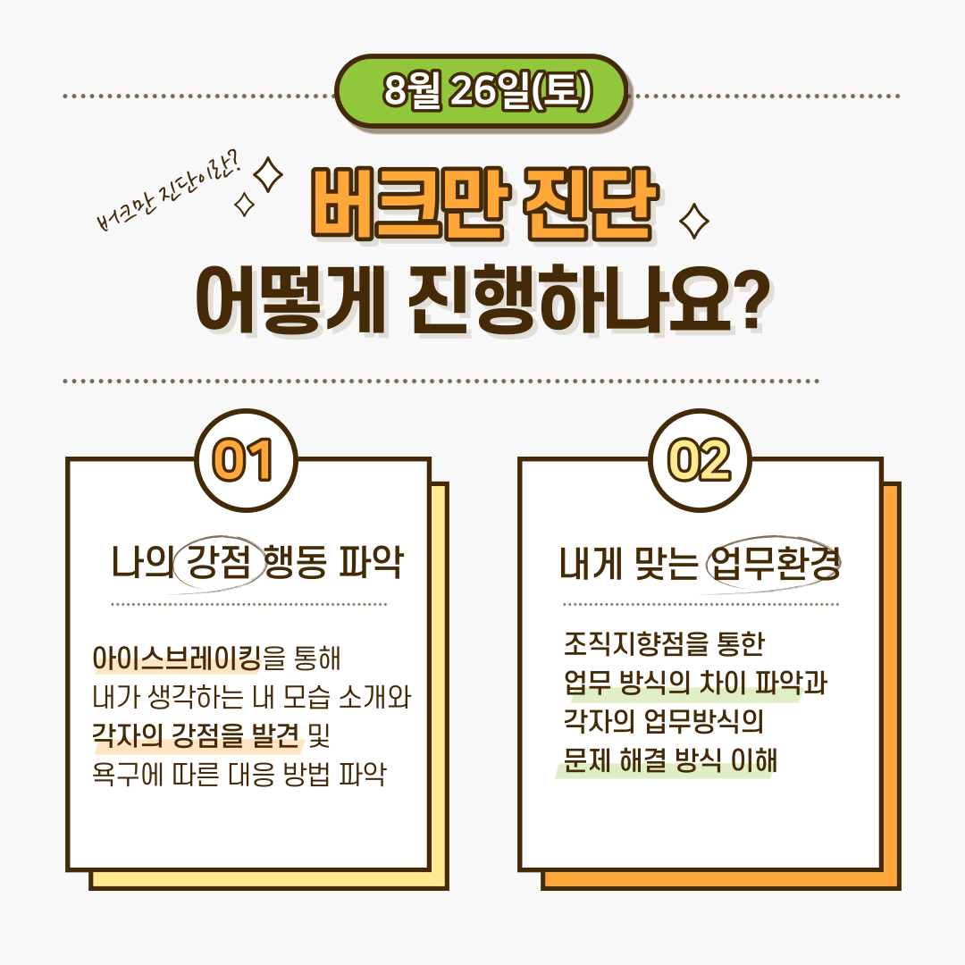 | 6 | 3회기 버크만 진단 (2그룹) | 2023-08-26 15:00 ~ 2023-08-26 17:00 |