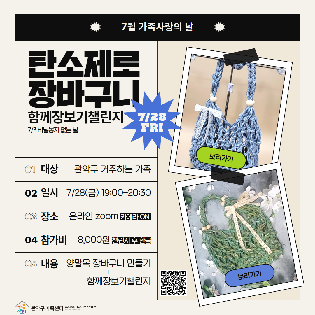 [관악구] 가족사랑의날 7월 비/닐/봉/지/없/는/날/편 ☆탄소제로 장바구니&함께장보기 챌린지☆