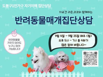 1인가구분들의 자기수용과 이해, 사회적 감수성 향상을 위한 '반려동물 매개 집단상담 진행합니다.