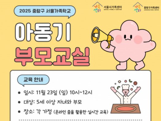 - 취약위기가족(한부모가정, 기초생활수급 및 차상위 가정, 온가족보듬사업 이용경험자, 다자녀가정 우선 모집) 중랑구가족센터 2층 교육실