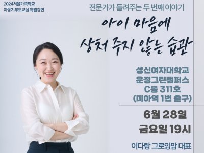 *본 프로그램은 "서울가족학교 아동기부모교실" 특강으로 진행되며 성신여자대학교 연구산학현력단과 서울특별시 강북구 키움센터 1호점의 지원으로 진행됩니다.