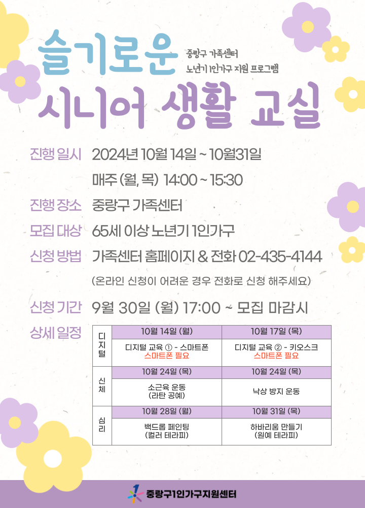 [중랑구] 노년기 1인가구 교육 및 여가문화 프로그램 '슬기로운 시니어 생활 교실' 참여자 모집