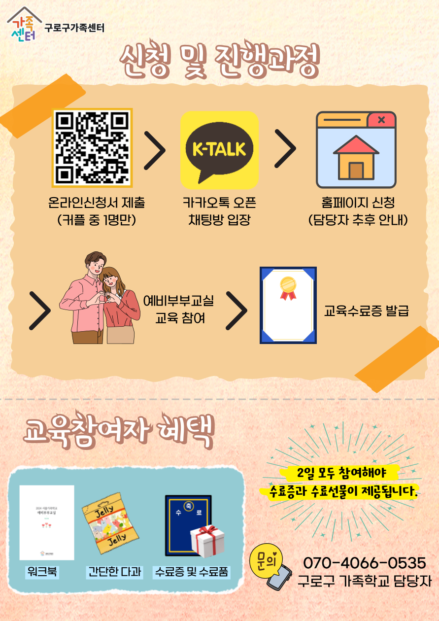 - 교육에 참여하시는 커플을 위한 간단한 다과와 워크북이 준비되어 있습니다. 편안한 마음으로 참석해 주세요! 😀