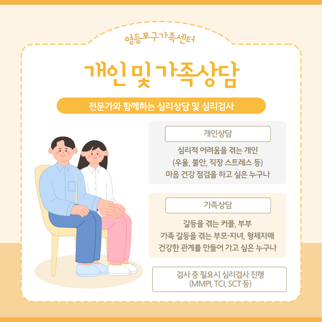 영등포구 가족센터에서는 개인 및 가족상담을 상시 운영하고 있습니다.