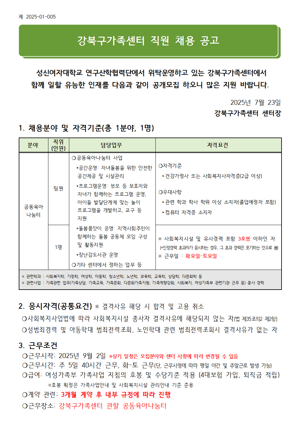 (제2025-01-005호) 2025년 강북구가족센터 직원 채용 공고