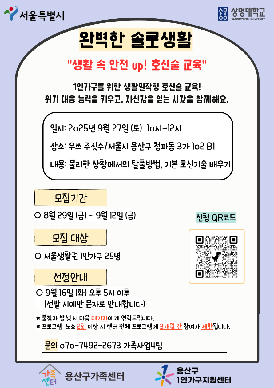 [용산구] 완벽한 솔로(전연령 1인가구) 호신술 교육프로그램 참여자 모집중