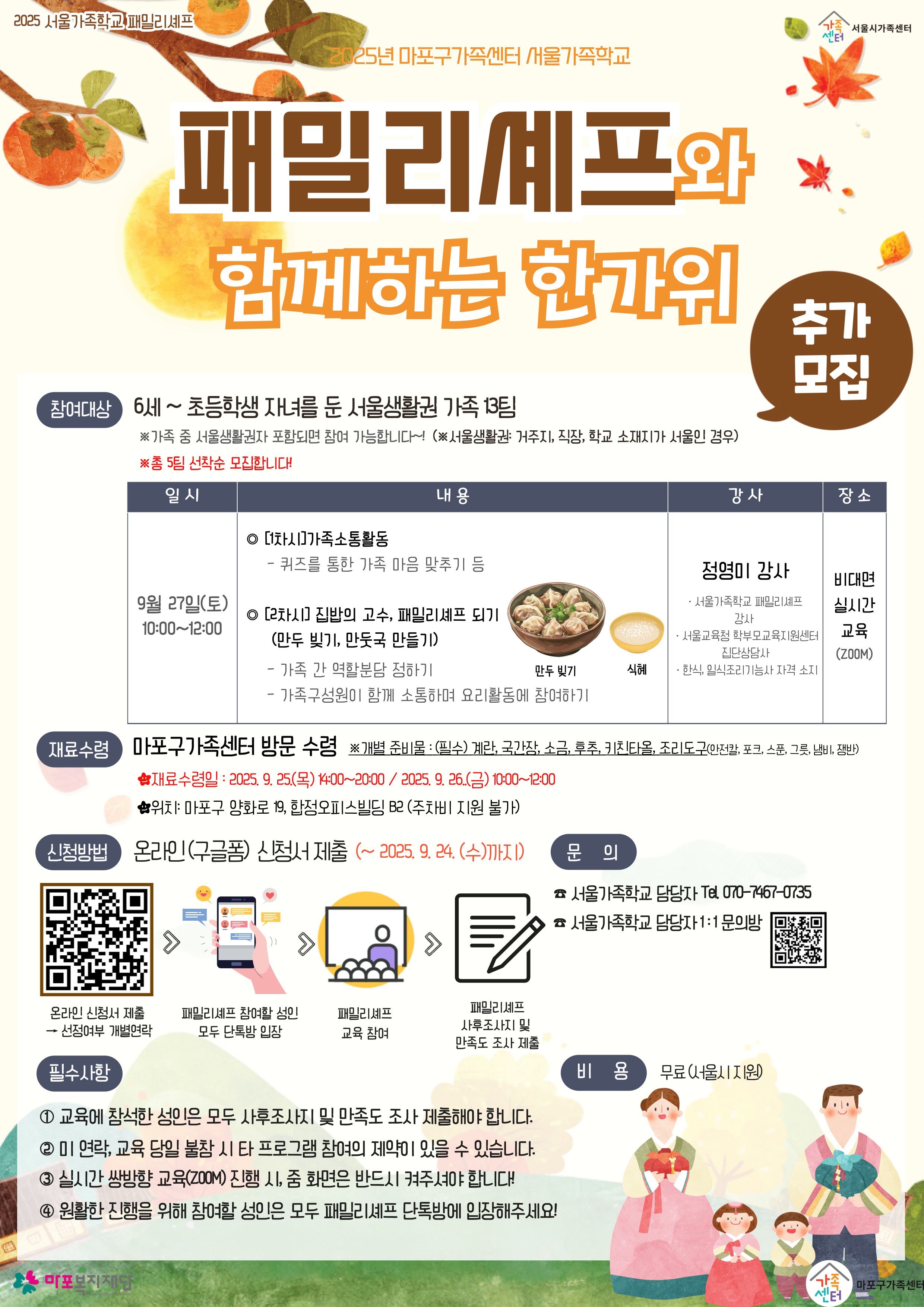 [마포구가족센터, 패밀리셰프 9월 참여가족 모집]