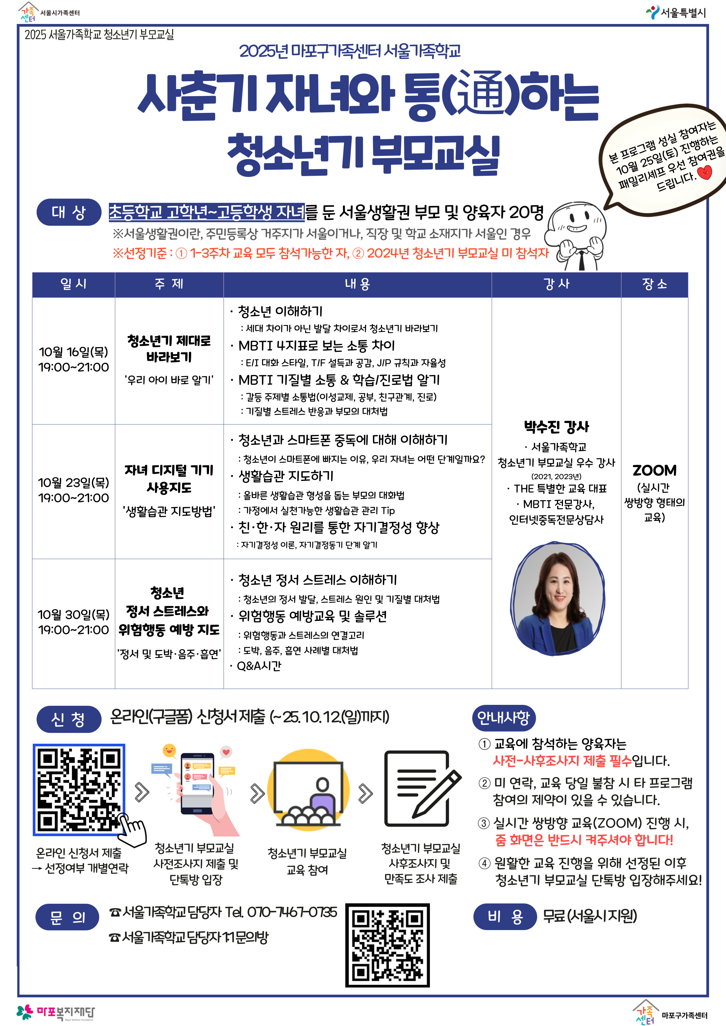 📌 강사: 박수진 강사(청소년기 부모교실 우수강사, MBTI 전문강사, 인터넷중독전문상담사)