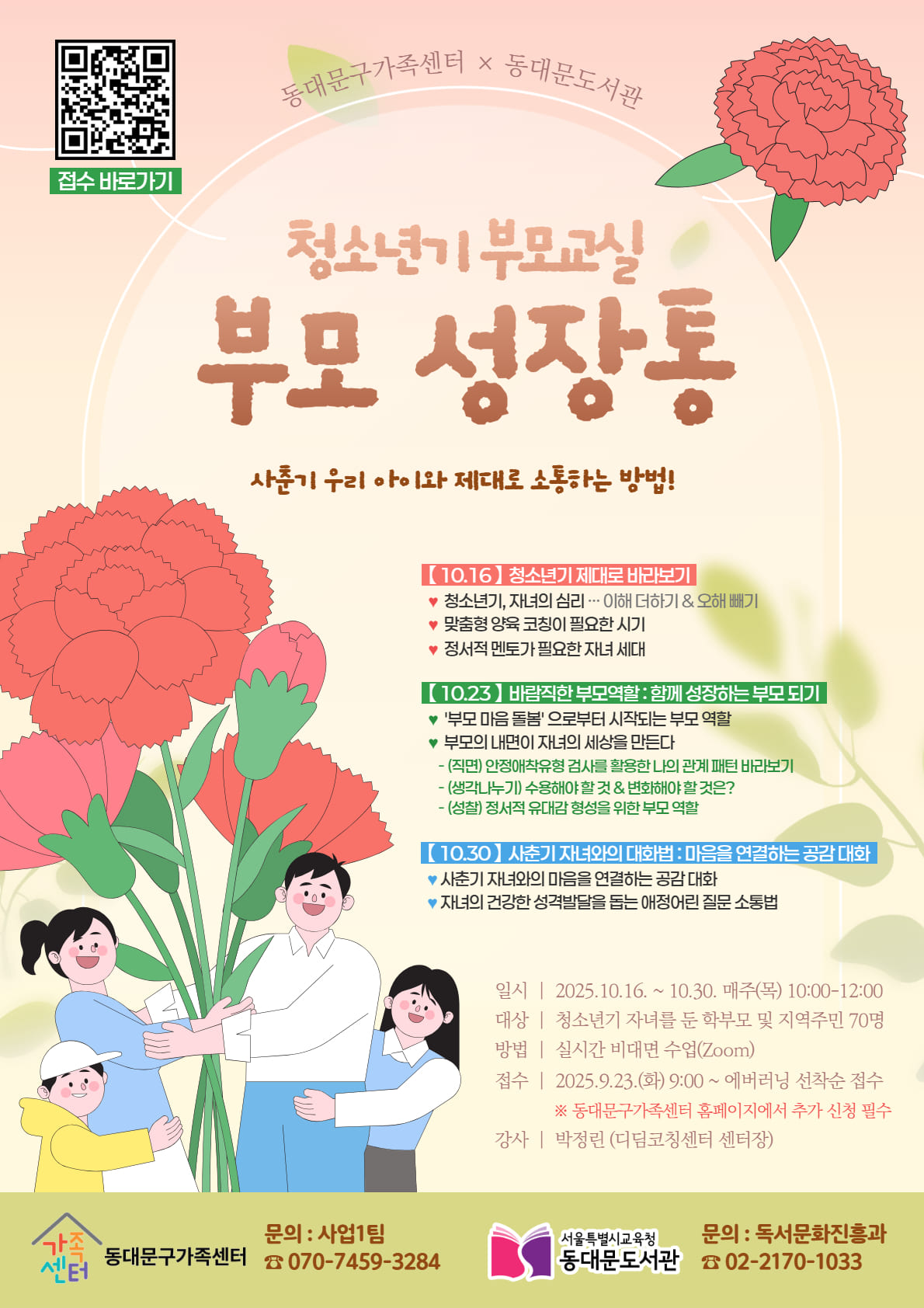 갑자기 훌쩍 커 버린 아이들을 보면 이제 어른 대접을 해 줘야 하나 싶다가도, 너무도 철없는 말과 행동을 보면 속이 터지기도 하는 것이 청소년기 부모입니다. 본격적으로 학업에 집중해야 하는 시기라 성적과 진로 스트레스에 갈등도 많이 생기죠. 이 시기 부모는 어떤 역할을 해야 자녀와 부모 모두 행복하게, 건강하게 성장할 수 있을까요? [청소년기 부모교실]에서 배워보세요.