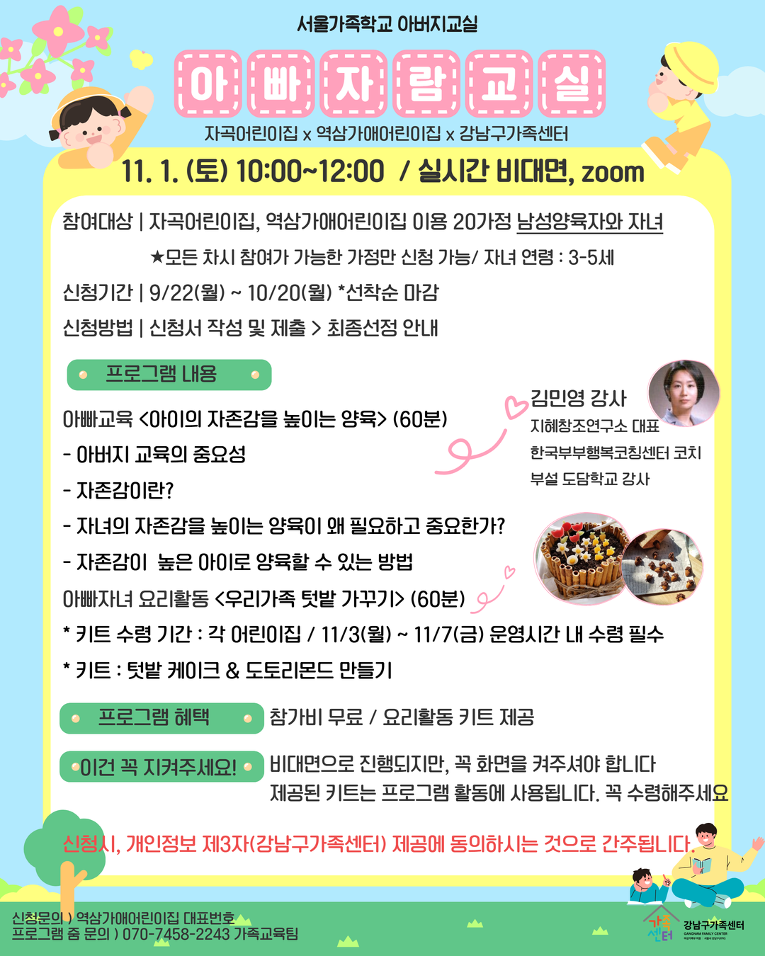 - 강남구 거주 및 생활권 5-7살 자녀를 둔 가정 20팀 서울특별시 강남구 도곡로18길 57 도곡정보문화도서관 지하2층