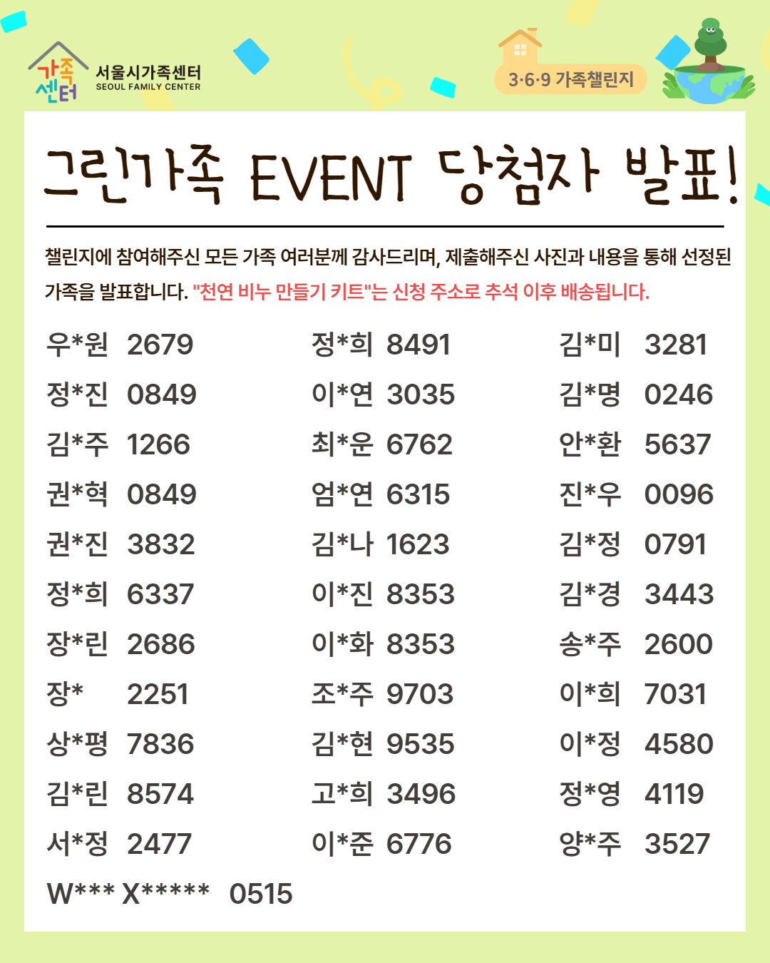 🌳[3·6·9 가족챌린지] "그린가족 EVENT" 당첨자 발표!!