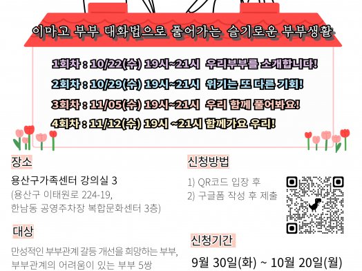 - 만성적인 부부관계갈등 개선을 희망하는 부부, 부부관계의 어려움이 있는 부부 5쌍 용산구가족센터 강의실 3