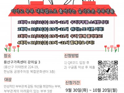 - 상담에 관심이 있는, 2일 모두 참석 가능한 만 20세 이상의 개인 및 부부, 선착순 약 6명 모집 용산구가족센터 강의실3
