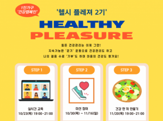 지속가능한 "걷기" 운동으로 건강관리도 하고 나의 걸음 수로 "기부"도 하며 마음의 건강까지 챙기는 1인가구 건강캠페인 '헬시 플레져' 모집 중에 있습니다!