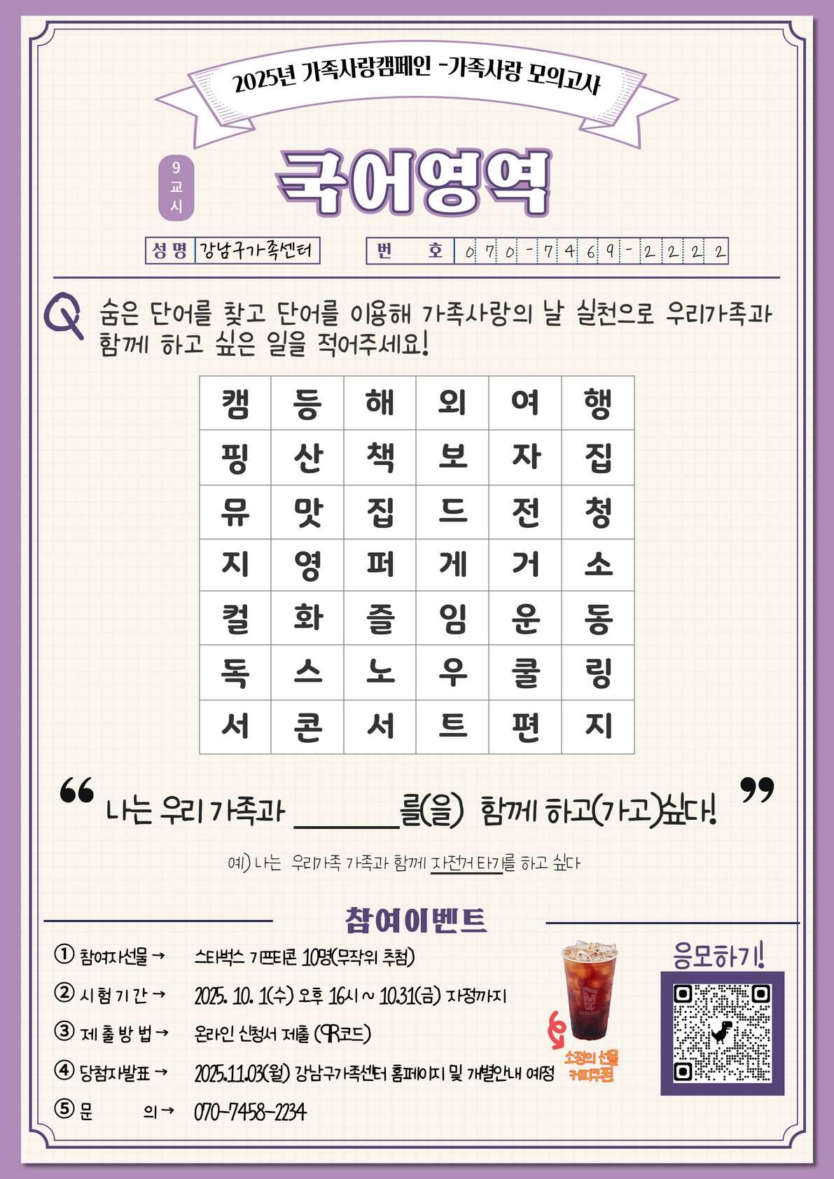 2025년 9번째 캠페인 <가족사랑 모의고사: 국어영역>에 참여하고, 카페인 충전~ 시원한 아메리카노 받아가세요!