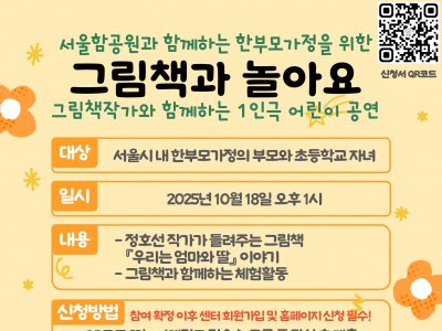 서울함공원과 함께하는 이번 행사는 서울시 내 한부모가정의 부모님과 12~21년생 자녀를 위한 특별한 프로그램입니다. 그림책 작가의 생생한 낭독과 체험활동으로 아이들과 특별한 시간을 보내보세요!