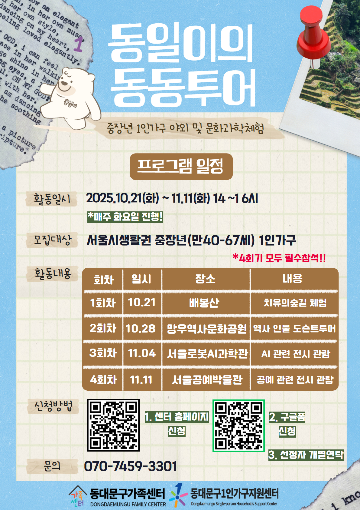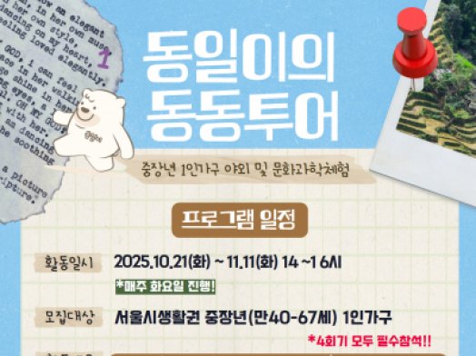 중장년 1인가구를 위한 야외 및 문화과학체험 '동일이의 동동투어' 하반기 참여자를 모집합니다!