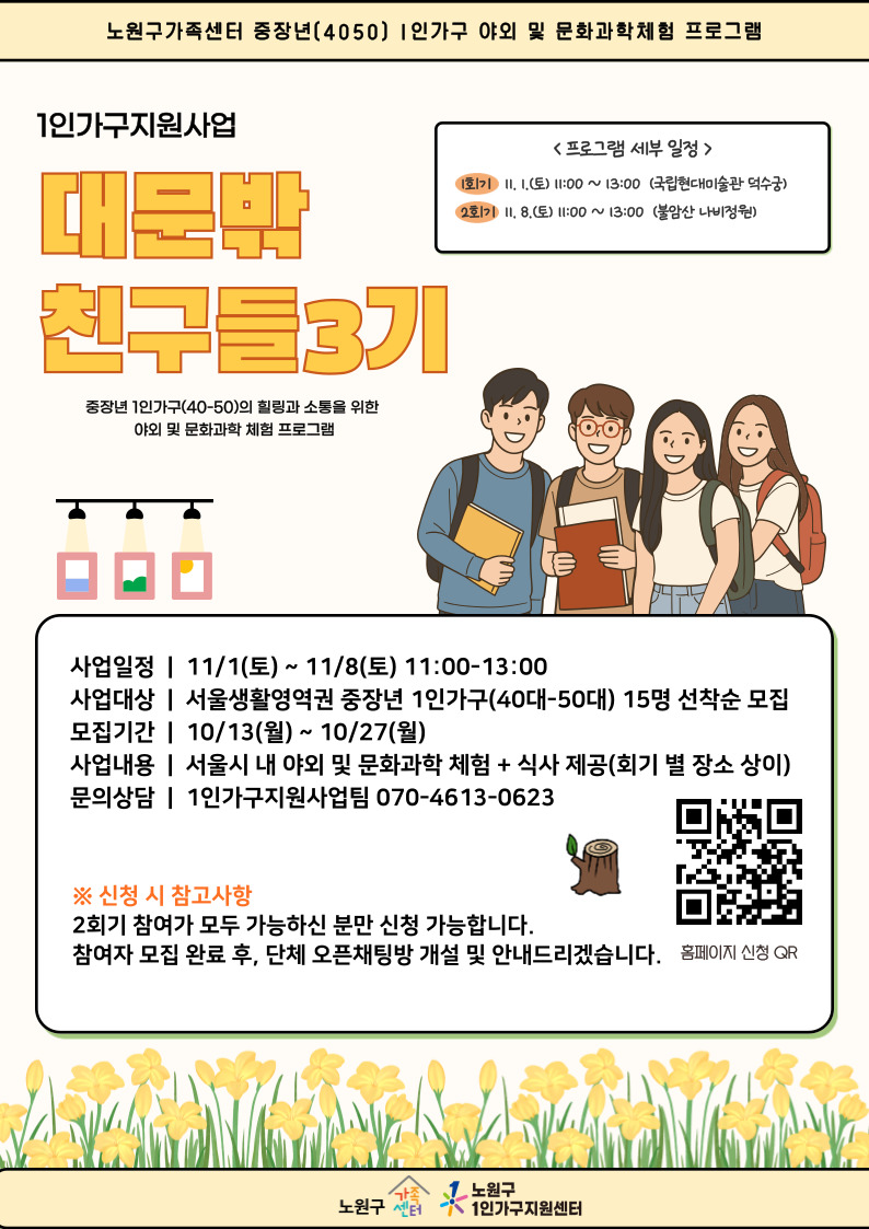 - 노원구[노원구] 1인가구 중장년 야외 및 문화과학 체험 프로그램 참여자 모집증