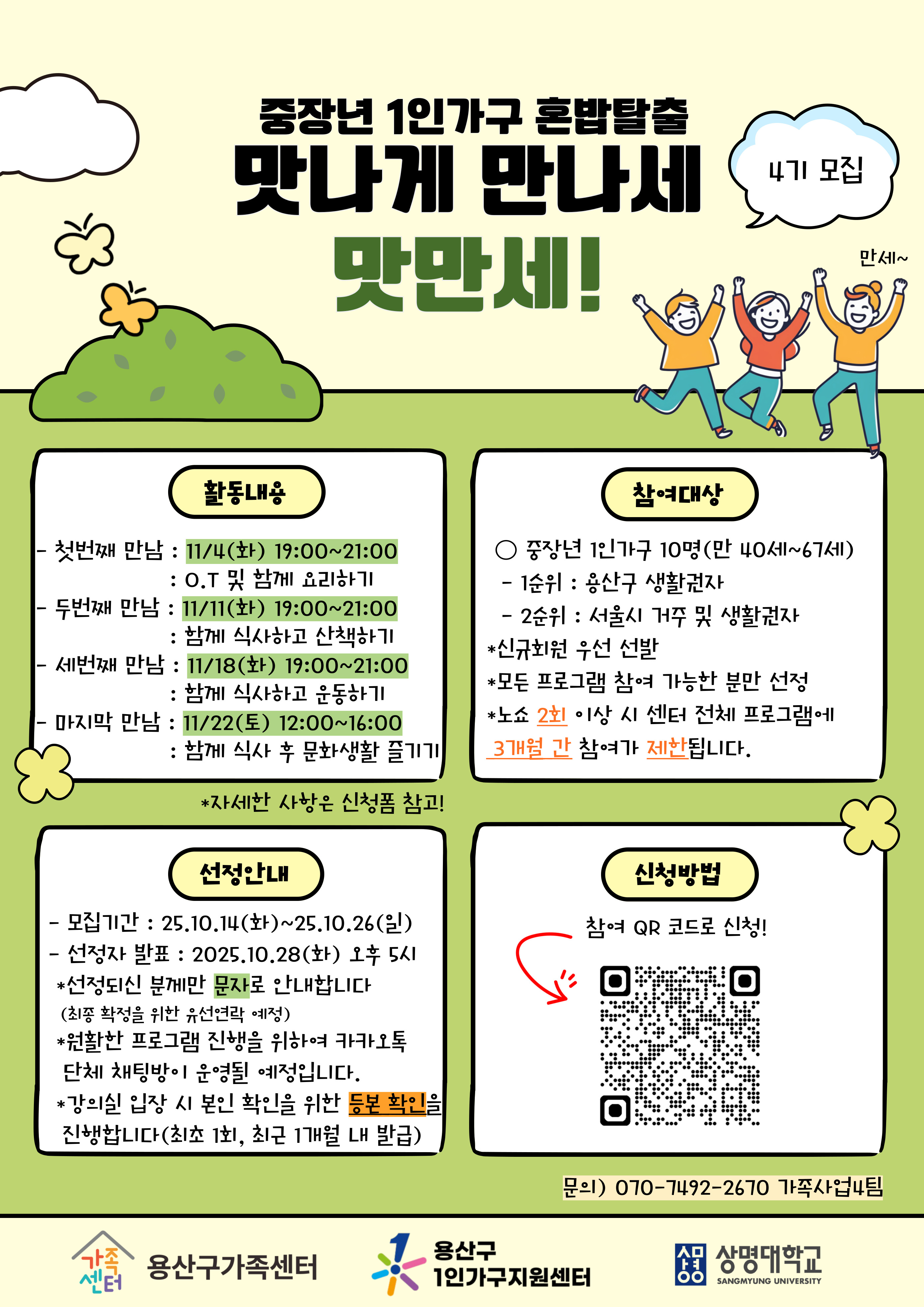 - 용산구[용산구] 중장년1인가구혼밥탈출-맛나게 만나세 맛만세! 4기 모집