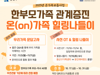 | 1 | (비대면) 우리가족 문답고사 | 2025-11-03 09:00 ~ 2025-11-07 18:00 |