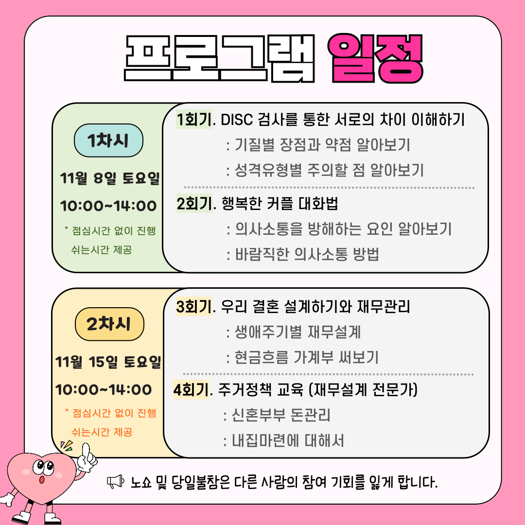 서로에 대해 알아가는 시간과 커플 대화법, DISC 등 예비부부를 위한 맞춤형 강의가 준비되어 있습니다.