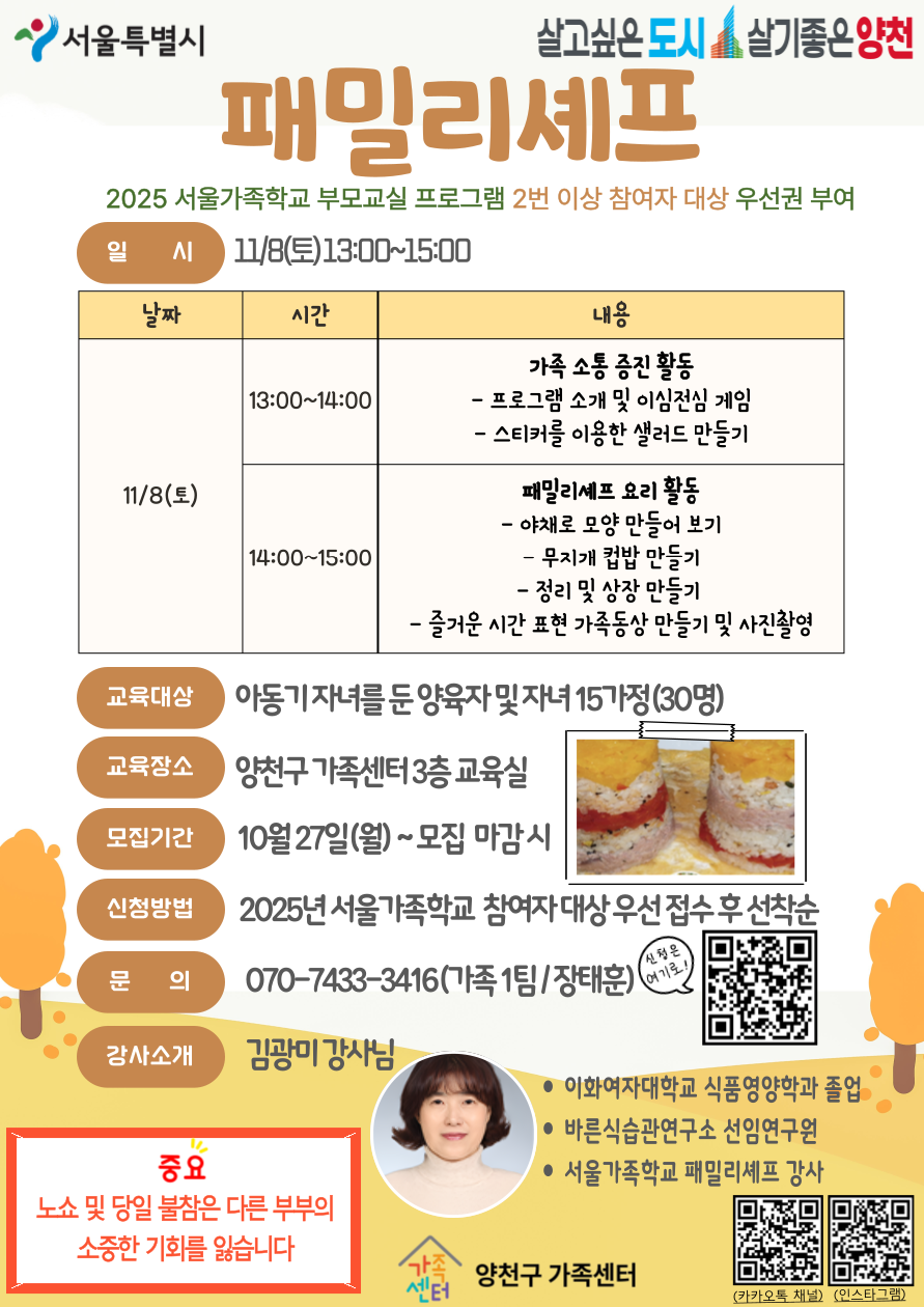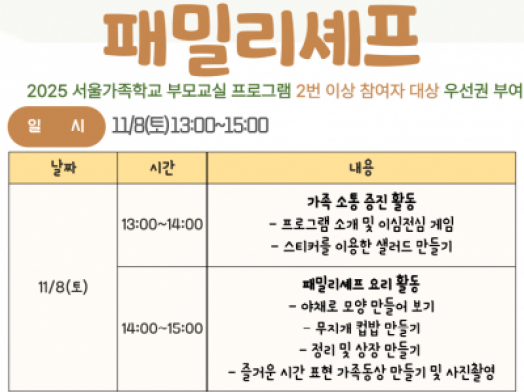 본 프로그램은 2025 서울가족학교 부모교실 프로그램 2번 이상 참여자 대상 우선권 부여 후 선착순 접수 입니다 ![]()