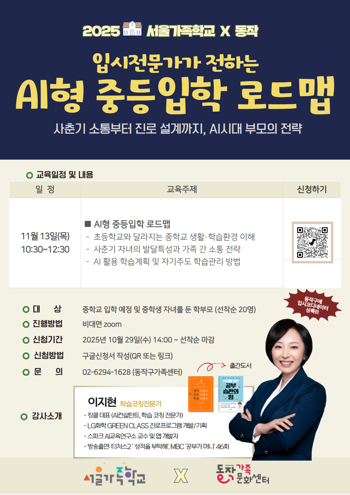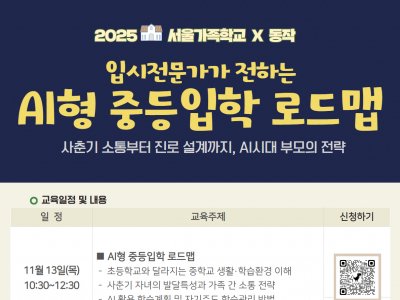 2025 동작가족학교에서는 입시전문가를 모시고 'AI형 중등입학 로드맵' 교육을 진행합니다.