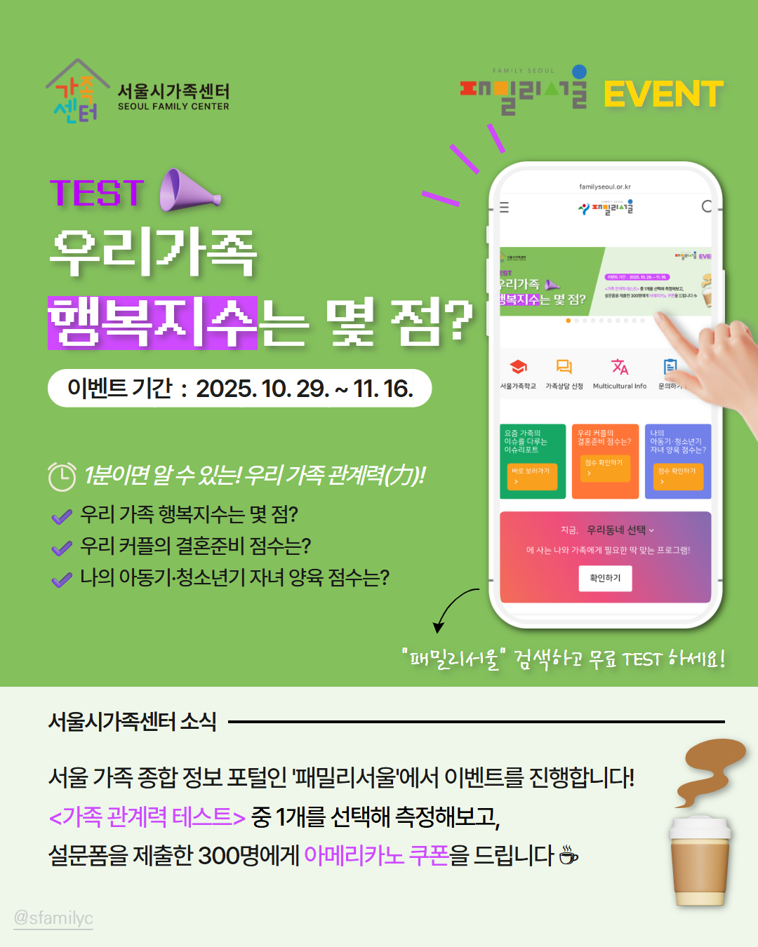 📢 2025 패밀리서울 <가족 관계력 테스트> 커피 쿠폰 이벤트! (~11. 16.)