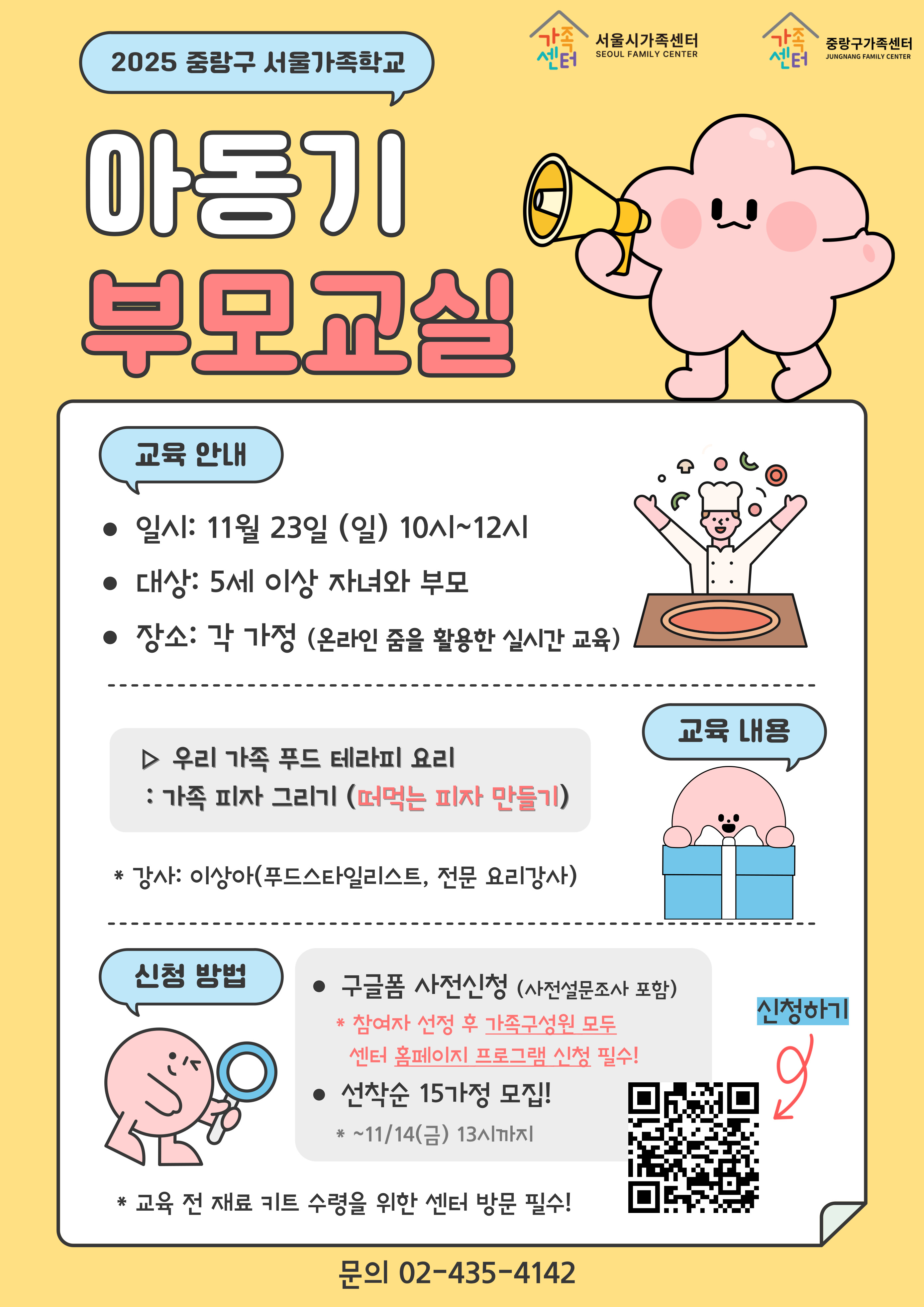 - 취약위기가족(한부모가정, 기초생활수급 및 차상위 가정, 온가족보듬사업 이용경험자, 다자녀가정 우선 모집) 중랑구가족센터 2층 교육실