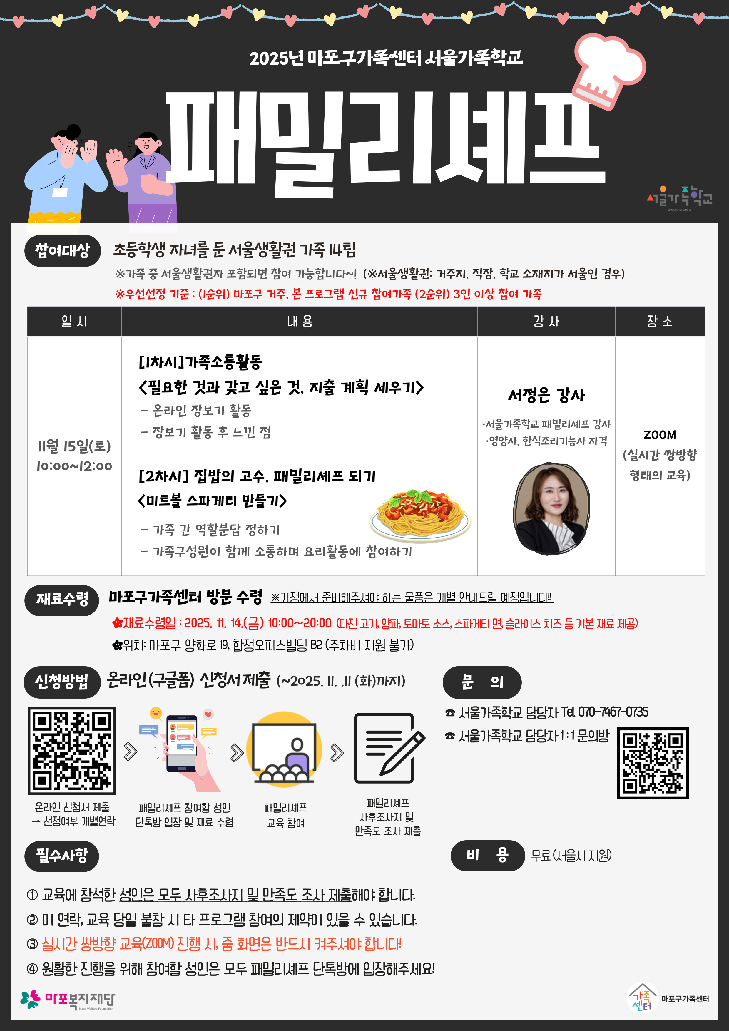 마포구가족센터에서 초등학생 자녀를 둔 가족을 위한 '패밀리셰프' 참여 가족을 모집합니다!