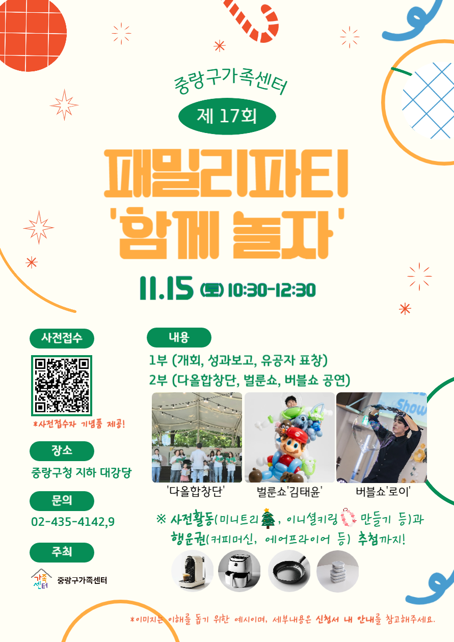 2025년 한해 아낌없는 지지와 격려를 보내준 센터 이용자와 중랑구민이 함께 즐길 수 있는 '제17회 패밀리파티, 함께 놀자'를 진행하오니 많은 관심과 참여 부탁드립니다.