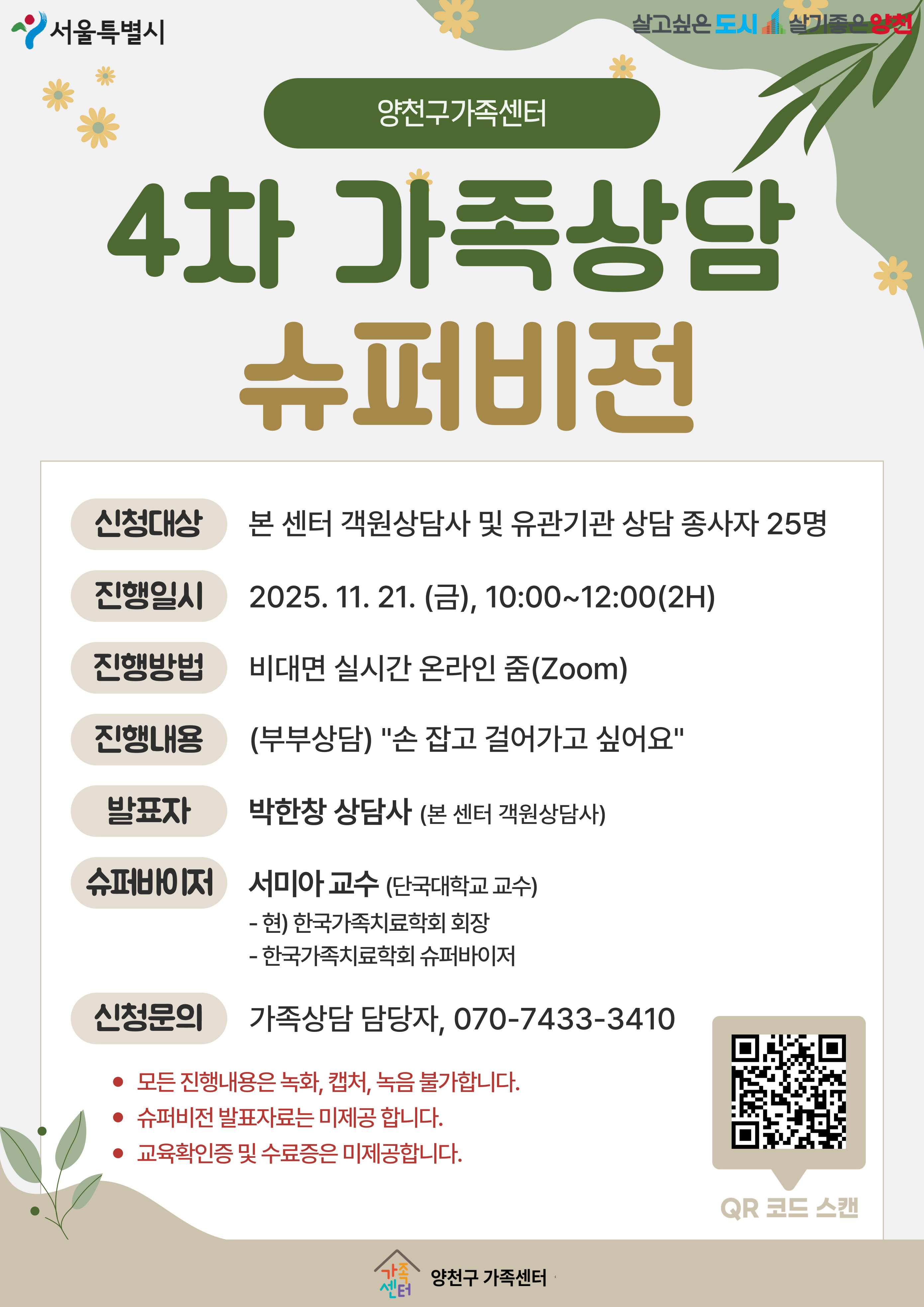안녕하세요? 양천구가족센터에서 2025년 4차 가족상담 슈퍼비전을 진행합니다.