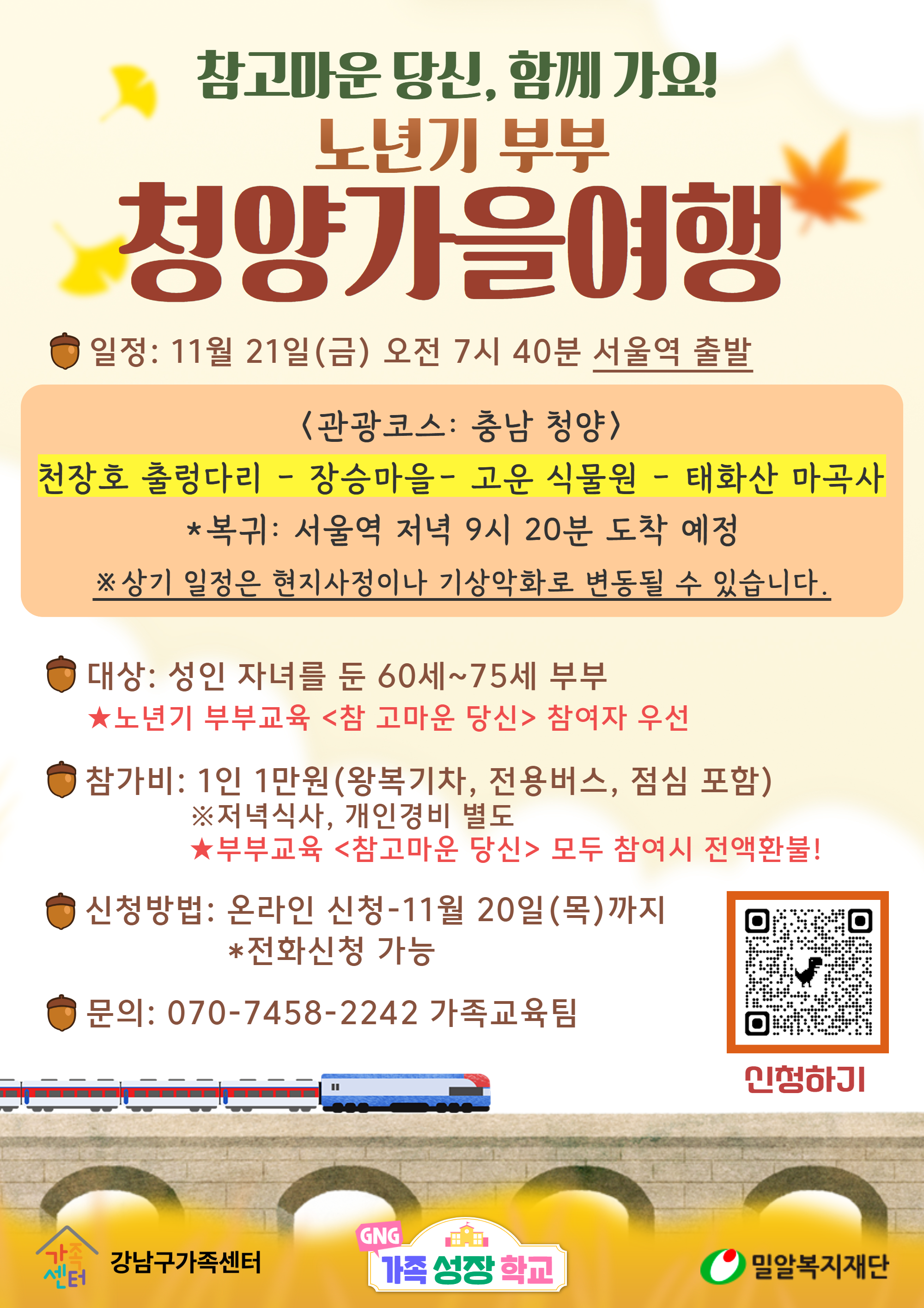 <청양 가을여행>과 부부 소통교육 <참 고마운 당신>이 연달아 진행되니 많은 관심과 참여 바랍니다^^