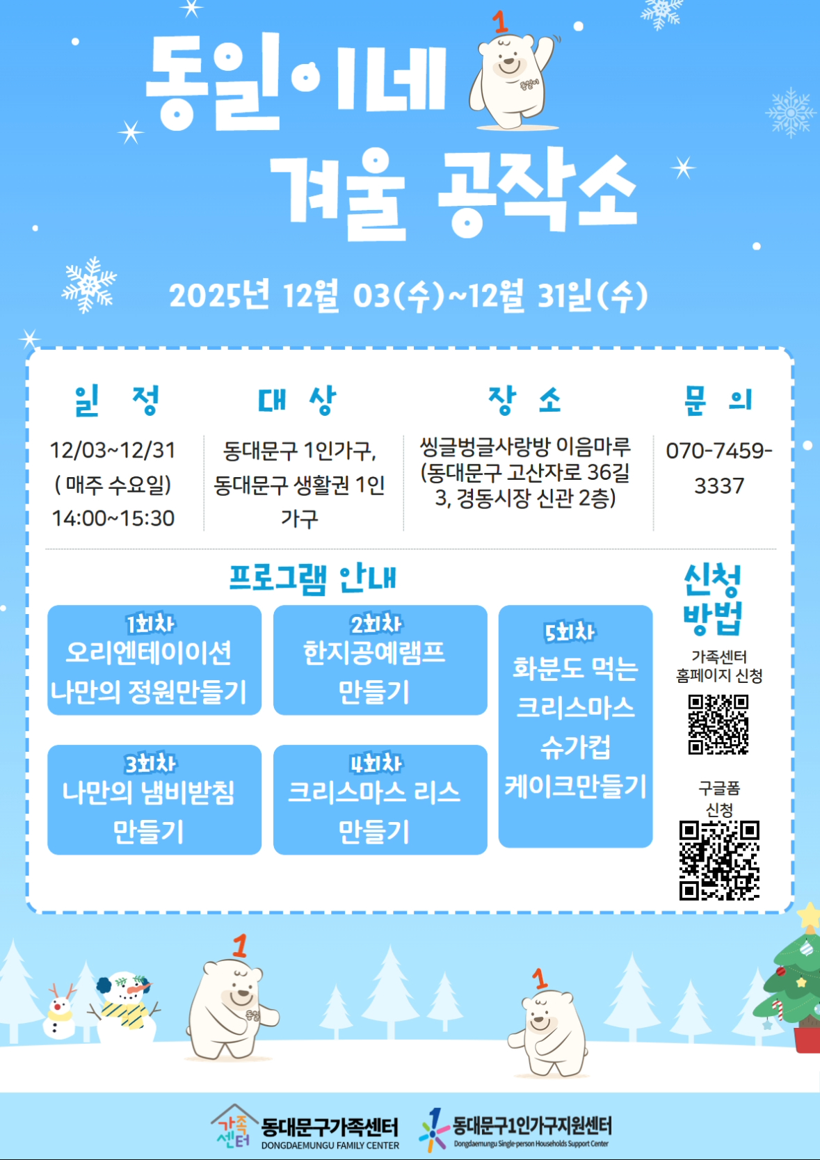 “따뜻한 손길로 만드는 겨울 공작소! 나만의 정원부터 크리스마스 리스까지, 여러분을 초대합니다.” 동대문구 가족센터에서 기다리고 있겠습니다 ^^!!" 많은 참석 부탁드립니다.
